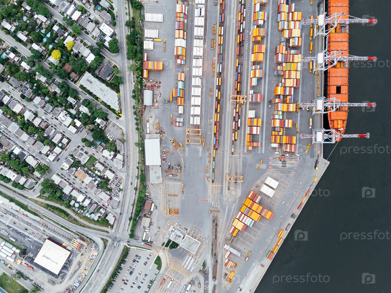 Вид с воздуха на порт Монреаля с грузовыми контейнерами, кранами и горизонтом города на закате. г
