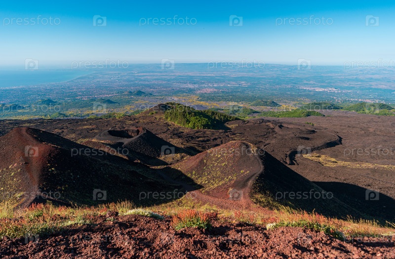 Панорамный вид со склона горы Этна на побережье и разрастающиеся города. Вулканический ландшафт острова Сицилия, Южная Италия