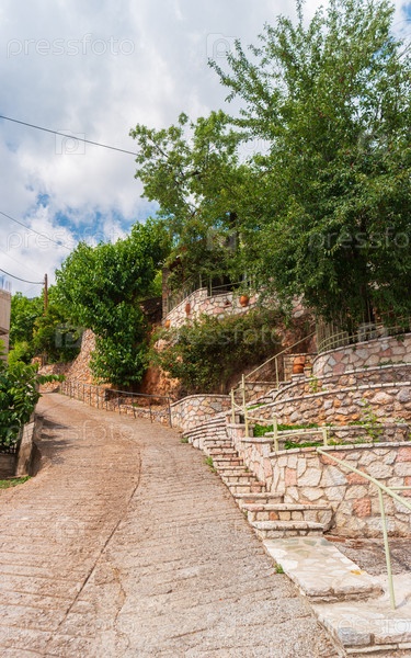 Дельфы, Греция. Пейзаж жилого района города с пышной зеленью. Крутой подъем по мощеной улице