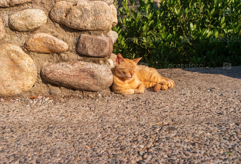 Мирная имбирная кошка дремлет возле каменной стены на фоне зеленой листвы. Это пушистый обитатель монастырей в горах Метеоры
