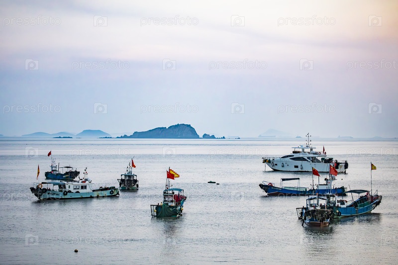 Рыбацкие лодки и катера на спокойном море на фоне островов