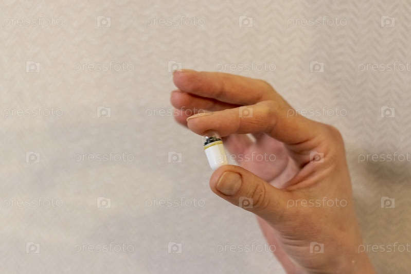 Женщина держит капсульную эндоскопическую камеру. Медицинская помощь