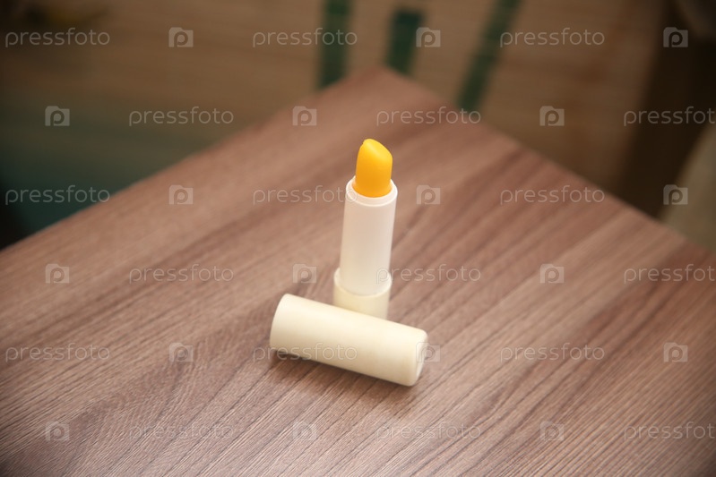 Гигиеническая губная помада на столе. Концепция гигиены и красоты. Накрасить губы гигиеническим средством
