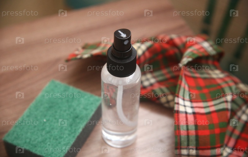 Средство для уборки с распылителем, салфеткой и губкой на столе. Концепция чистоты и гигиены. Вид сверху