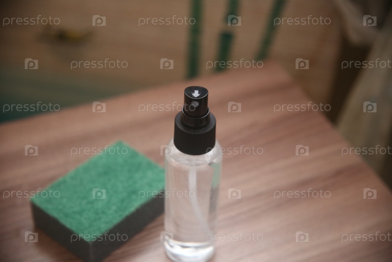 Средство для уборки с распылителем и губкой. Концепция чистоты и гигиены. Вид сверху