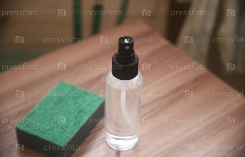 Средство для уборки с распылителем и губкой. Концепция чистоты и гигиены. Вид сверху