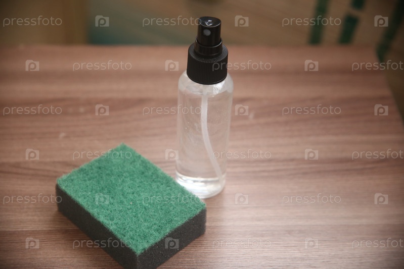 Средство для уборки с распылителем и губкой. Концепция чистоты и гигиены. Вид сверху