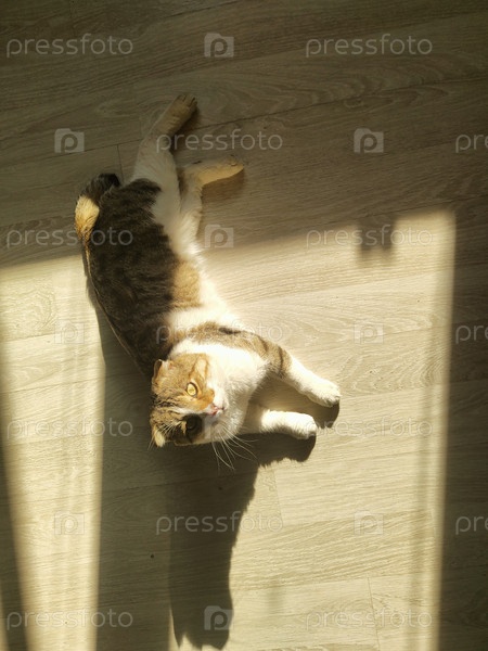 Кошка на полу при солнечном свете, уютный домашний фон, обои для животных