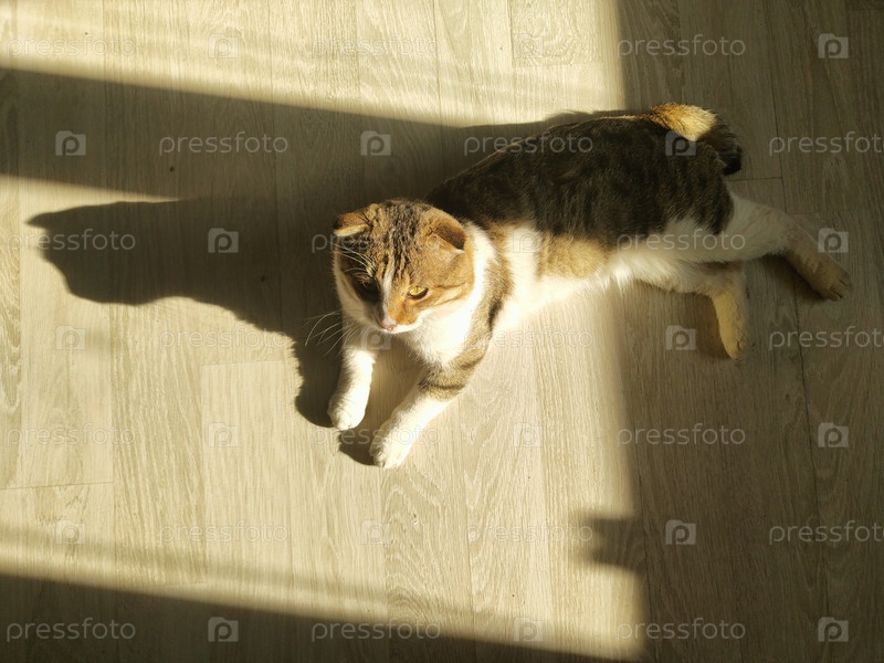 Кошка на полу при солнечном свете, уютный домашний фон, обои для животных