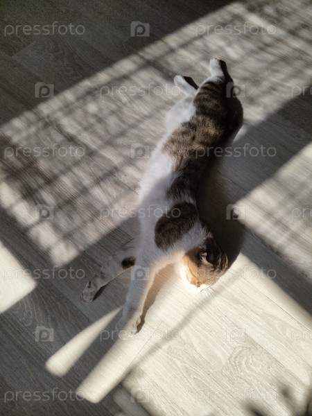 Кошка на полу при солнечном свете, уютный домашний фон, обои для животных