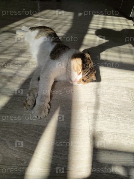 Кошка на полу при солнечном свете, уютный домашний фон, обои для животных