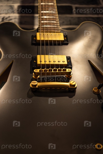 Профессиональная матовая черная полуполая электрогитара с золотыми хамбакерными пикапами и мостиком на темном текстурном фоне