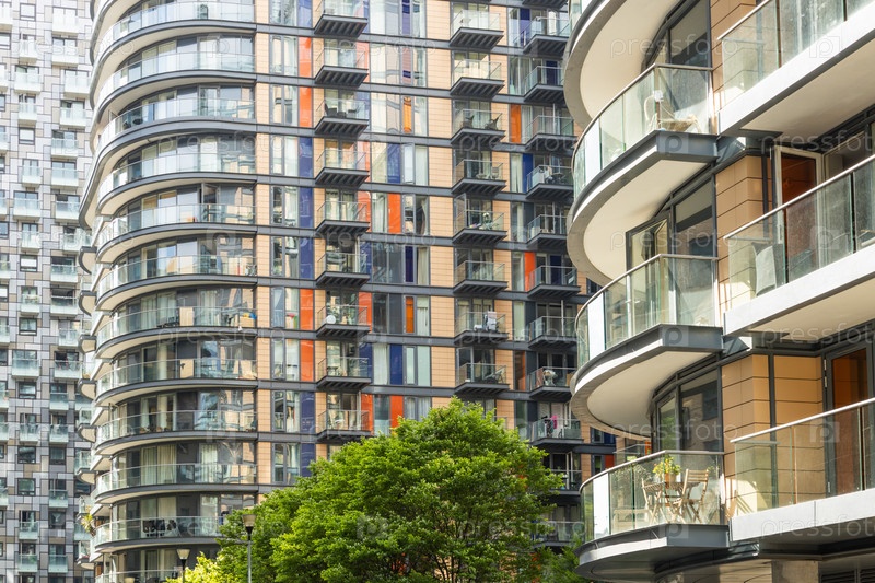 Вид на современные жилые здания с изогнутыми стеклянными балконами и яркими зелеными деревьями в городской обстановке