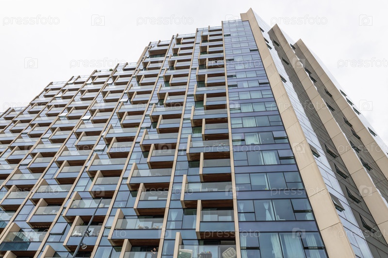 Восходящая перспектива современного высотного здания с узором балконов и стеклянных окон в городе