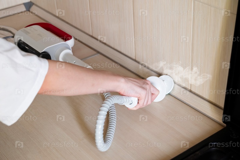 Использование кухонного прибора для чистки на поверхности шкафа в современной домашней обстановке