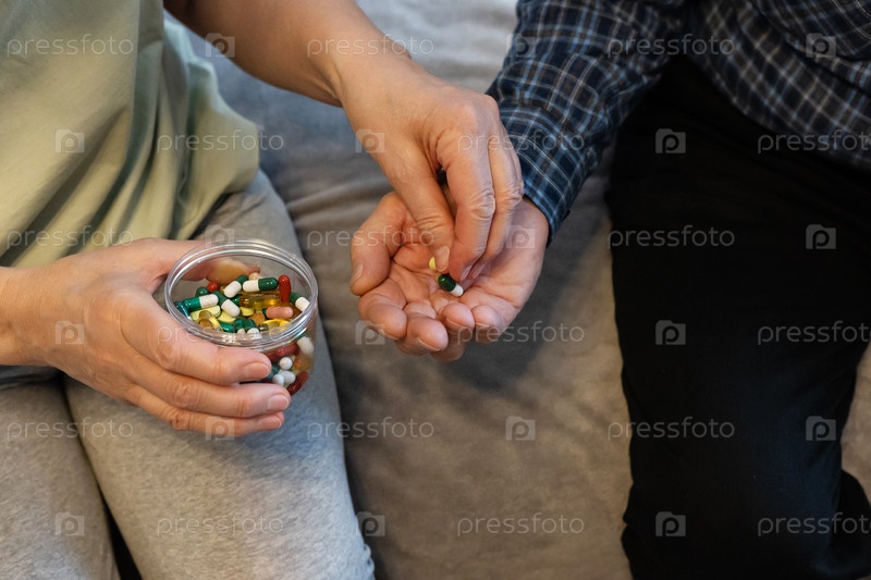 Пожилой человек получает помощь от опекуна, чтобы принимать лекарства в уютной домашней обстановке