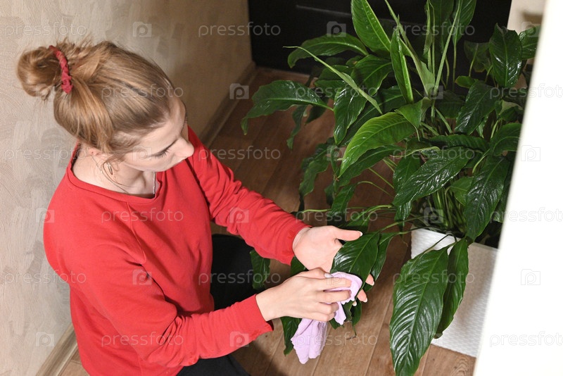 Женщина в фартуке поливает комнатные растения с помощью баллончика
