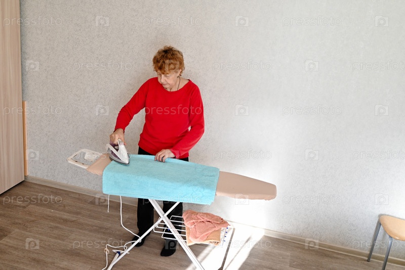 Средневековая седая женщина разговаривает на смартфоне, гладит одежду в прачечной