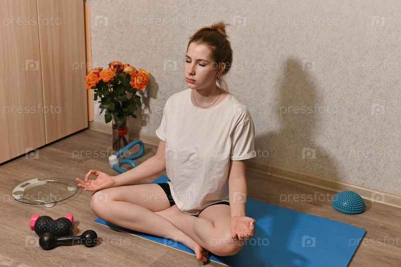 Молодая, красивая девушка занимается фитнесом дома. Девушка выполняет различные упражнения с помощью десны. Спортсмен тренируется через интернет