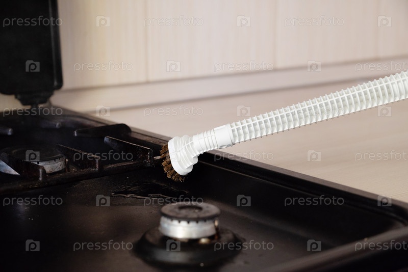 Пар поднимается из газовой плиты, в то время как человек использует кисть для очистки поверхности. Сцена показывает усилия по поддержанию кухонной техники. Днем здесь присутствует естественный свет