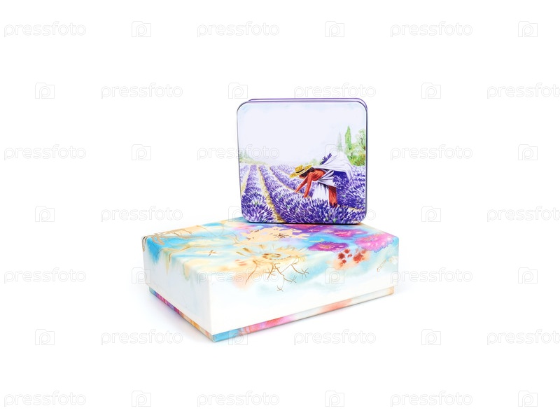 Бумажные и металлические подарочные коробки с цветочным рисунком, изолированные на белом фоне