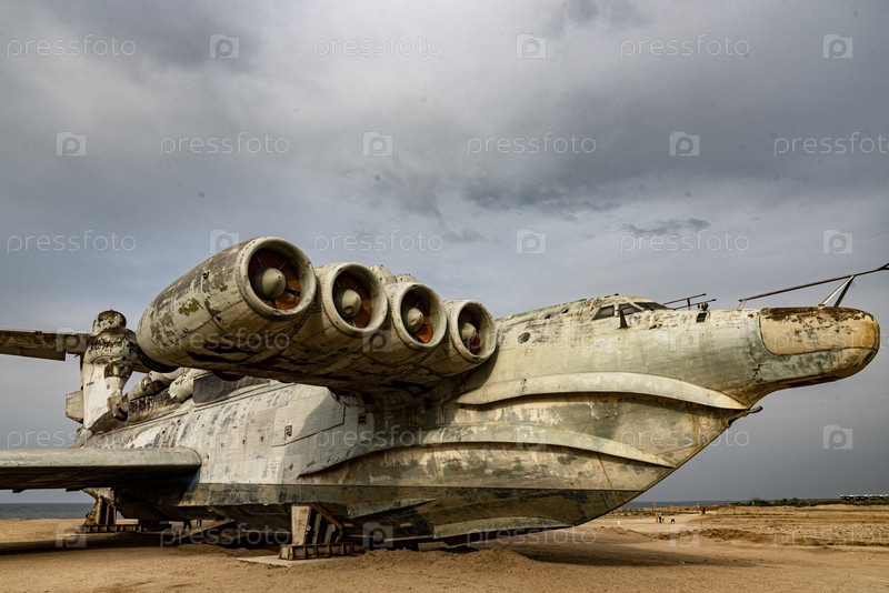 Заброшенный советский экраноплан 'Лунь' на песчаном берегу Каспийского моря
