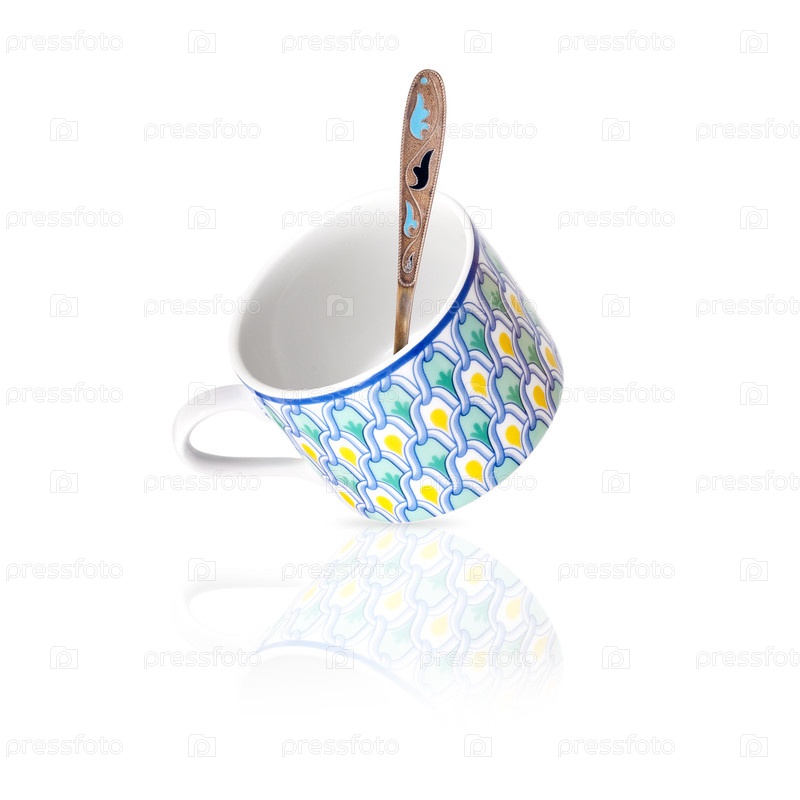Чайная чашка с средиземноморским орнаментом изолирована на белом фоне. Элемент дизайна с обрезкой пути