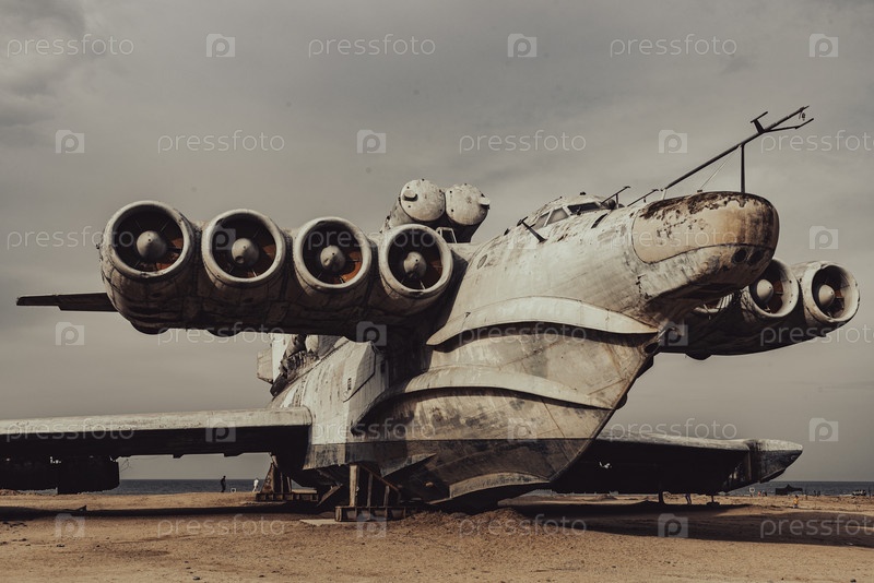 Заброшенный советский экраноплан 'Лунь' на песчаном берегу Каспийского моря