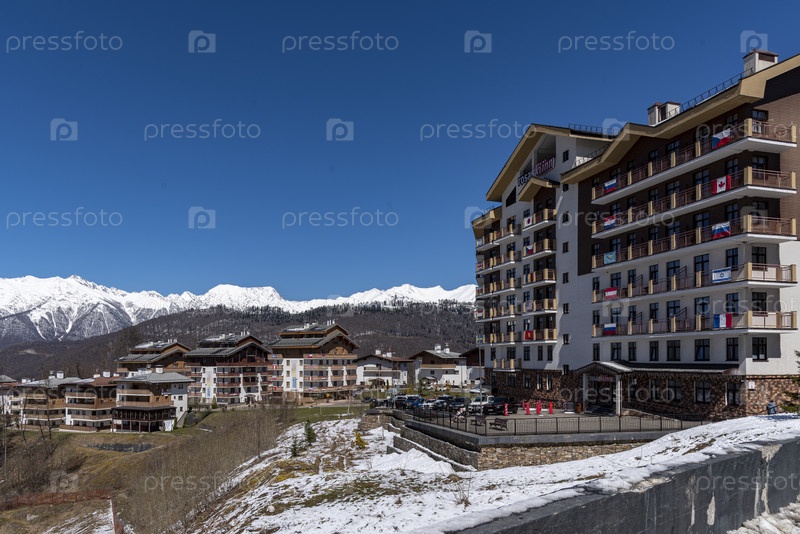 Современный горный курорт, окруженный заснеженным ландшафтом
