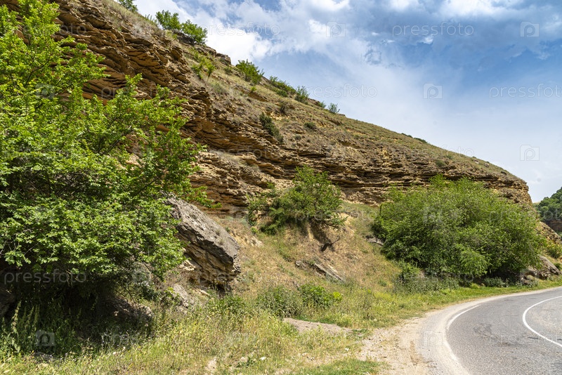 Живописный вид со стороны дороги с пышной зеленью и скалистыми выступами