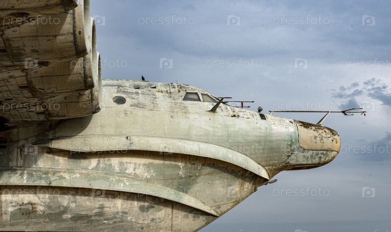 Заброшенный советский экраноплан 'Лунь' на песчаном берегу Каспийского моря