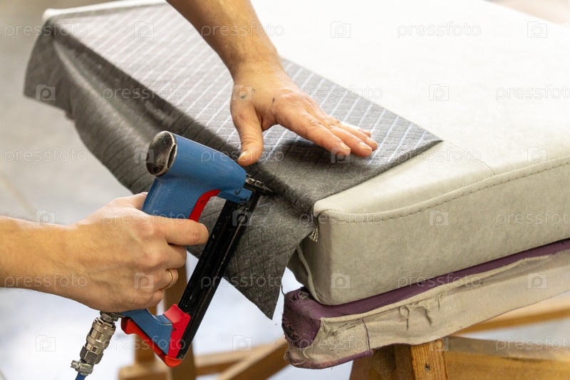 Рука рабочего оперирует синим пневматическим степлером