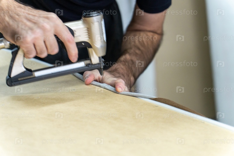 Рука рабочего оперирует синим пневматическим степлером