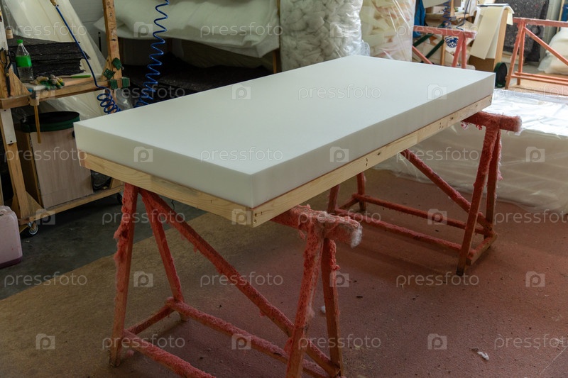 Пенопластовое матрасное ядро на деревянной раме в обивочной мастерской, готовое для резки и покрытия. Промышленный интерьер, показывающий процесс производства постельного белья
