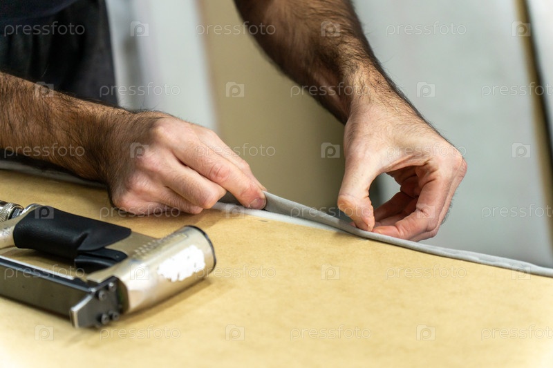 Завершение обивки рук складной тканью края на деревянной мебельной раме
