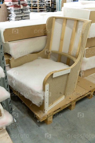 Незавершенная рама кресла с белой пеной на деревянном поддоне на мебельной фабрике. Процесс производства обивочной мастерской