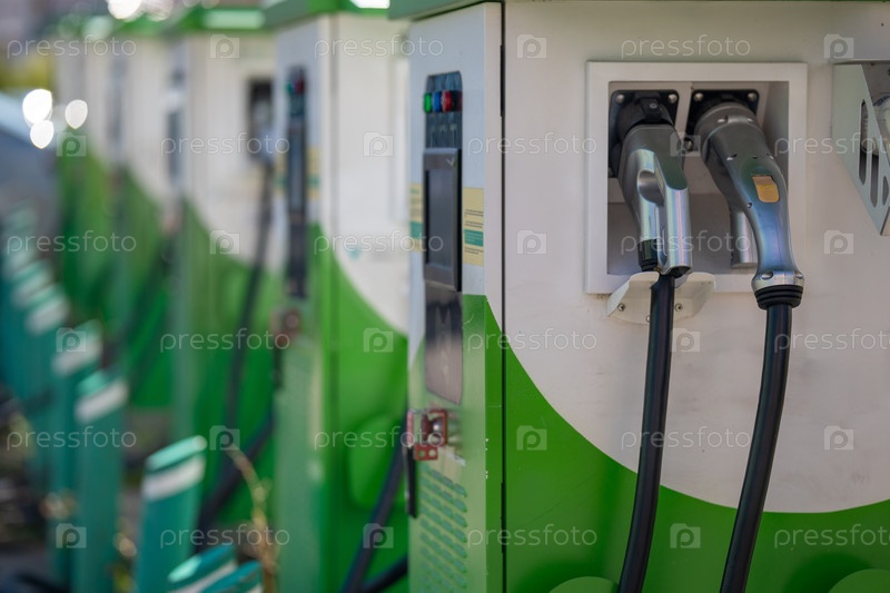 Общественные зарядные станции электромобилей подряд. Зарядные устройства для электромобилей символизируют зеленую энергию, электронную мобильность и будущее устойчивого транспорта