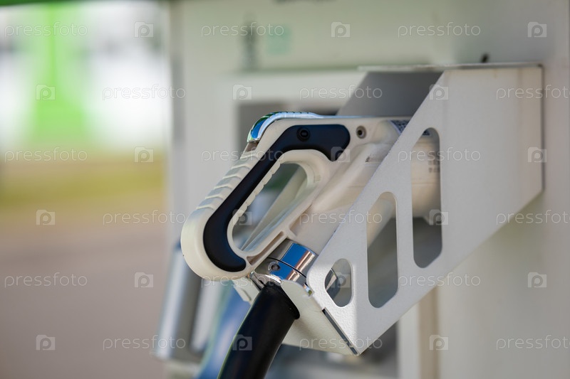 Зарядка электромобиля на общественной станции. Концепция электронной мобильности, зеленой энергии и будущего транспорта