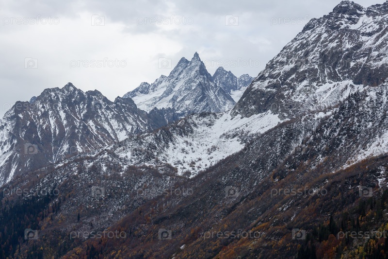 Пейзаж заснеженных горных вершин в заповеднике Теберда
