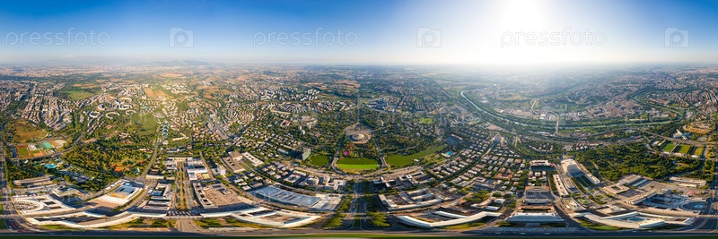 Рим, Италия. Квартал Всемирной выставки - EUR. Панорама города в летнее утро. Солнечная погода. Панорама 360. Вид с воздуха