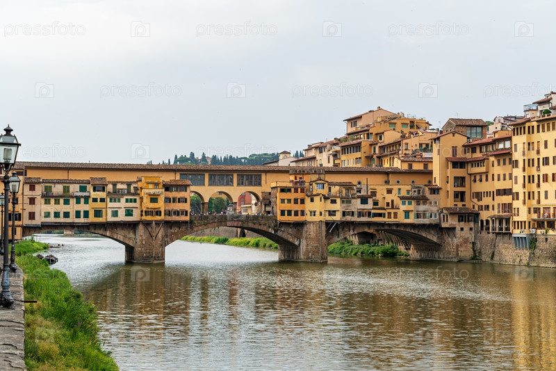 Флоренция, Италия. Понте Веккьо - средневековый арочный мост с сувенирными и ювелирными магазинами. Летний день