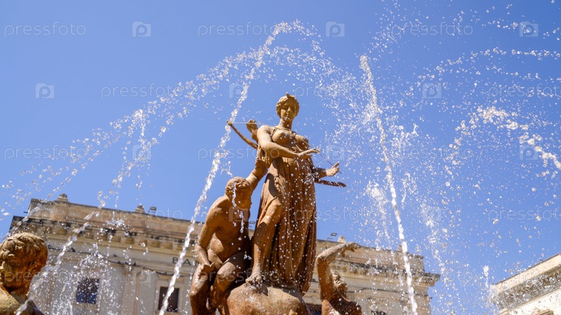 Сиракузы, Сицилия, Италия. Фонтан Дианы — классический фонтан со статуей богини охоты Дианы, созданный в 1907 году скульптором Джулио Мошетти. Солнечный летний день