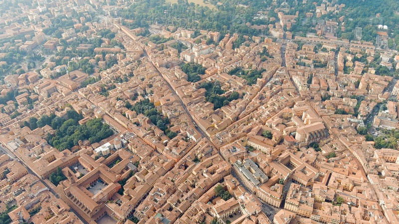 Болонья, Италия. Старый город. Панорамный вид на город. Лето, вид с воздуха