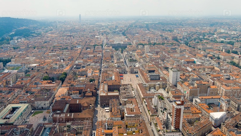 Турин, Италия. Туринский вокзал, площадь Сан-Карло. Панорама исторического центра города. Летний день, Aerial View