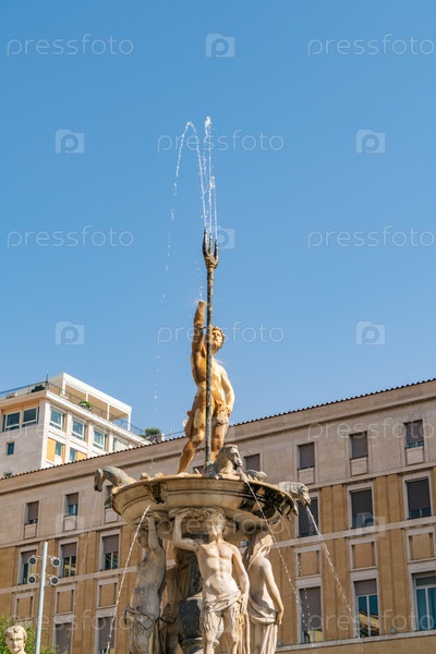 Неаполь, Италия. Фонтан Нептуна — фонтан, построенный в 1600 году с изысканной резьбой, изображающей Нептун, морских чудовищ, нимф и львов. Солнечное летнее утро