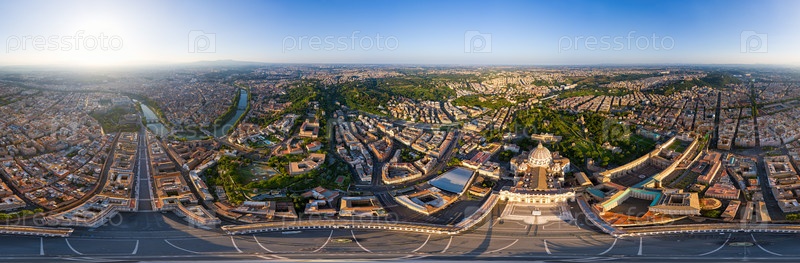 Рим, Италия. Собор Святого Петра — базилика Сан-Пьетро. Панорама города в летнее утро. Солнечная погода. Панорама 360. Вид с воздуха