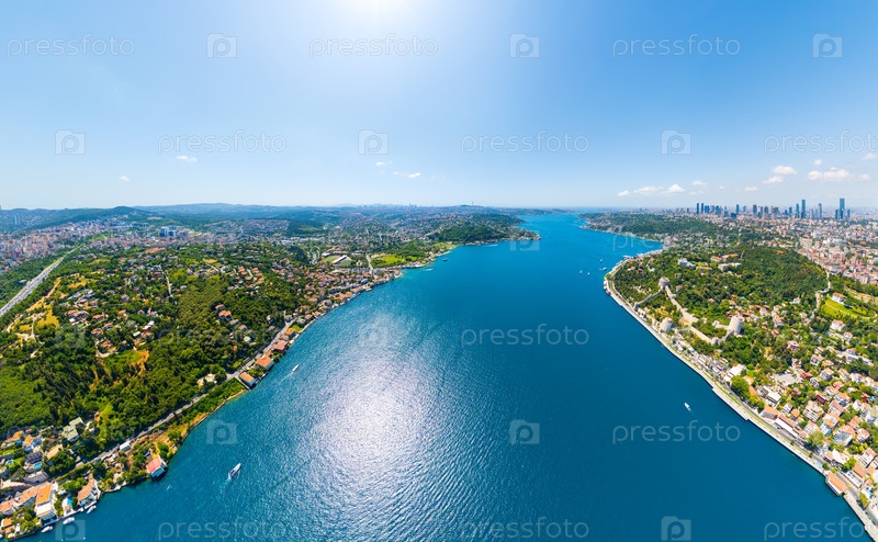 Стамбул, Турция. Птицеглазая панорама городского горизонта и Босфорского водного пути между континентами летом. Вид с воздуха