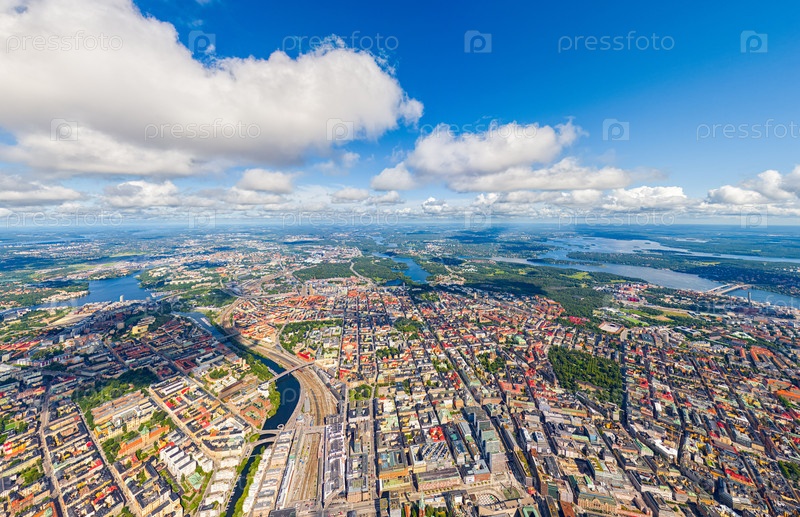 Стокгольм, Швеция. Панорама города летом в пасмурную погоду. Вид с воздуха