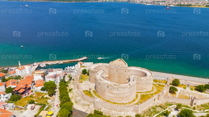 Килитбахир, Турция. Крепость Килитбахир стоит на береговой линии с видом на пролив Дарданеллы в ясный солнечный день. Вид с воздуха