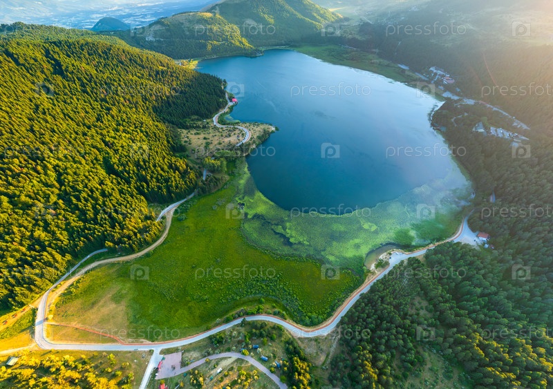 Болу, Турция. Абант - Большое пресноводное озеро, окруженное горами и лесом с живописными видами. Время заката. Летний пейзаж. Вид с воздуха
